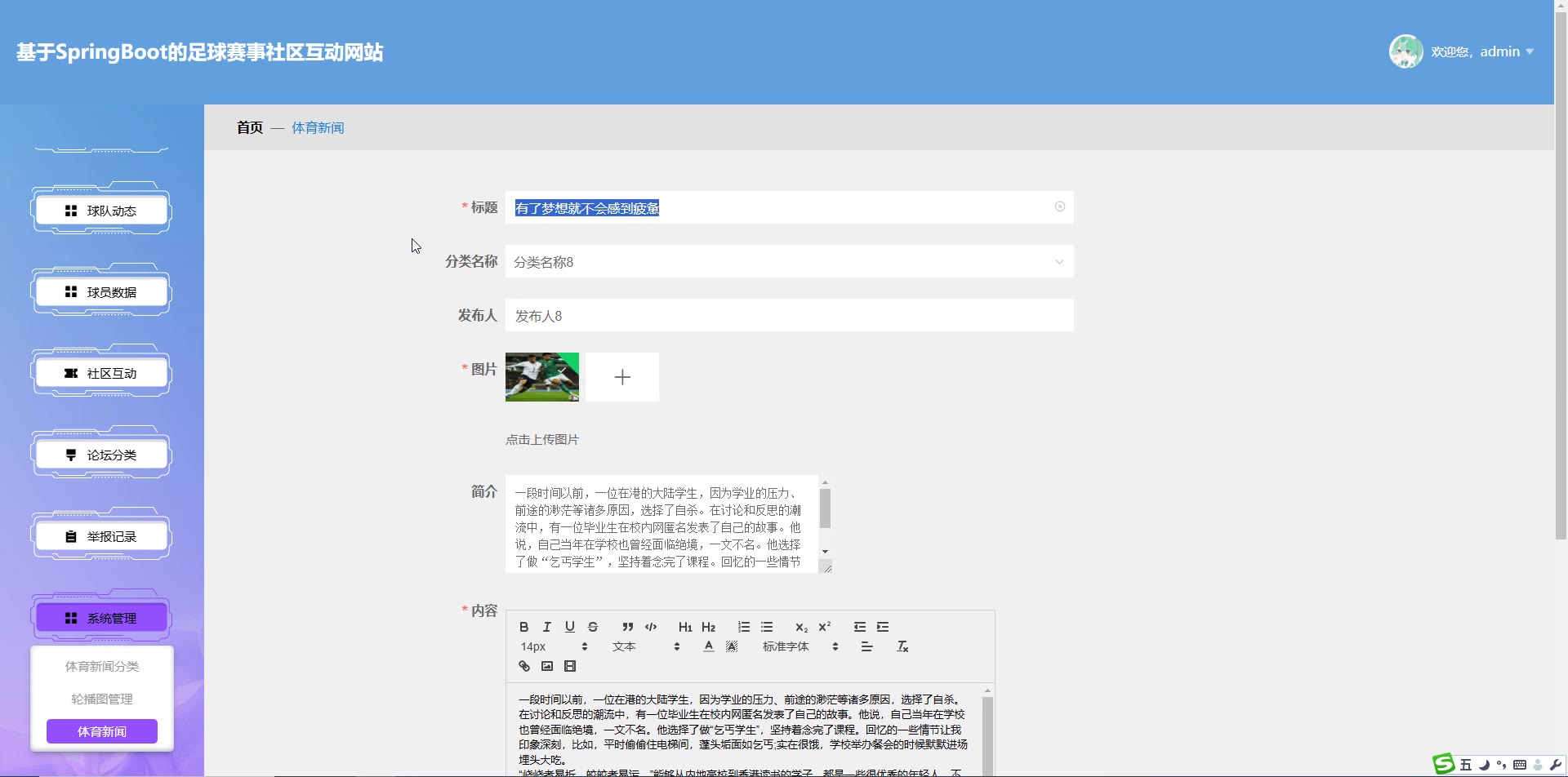 基于SpringBoot Vue的足球赛事社区互动网站源码+论文springboot1804